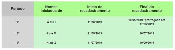 Nessa página, na parte principal, no conteúdo do banner Recadastramento / 2019, constam três tipos de relação nominal, conforme mostra imagem abaixo:
