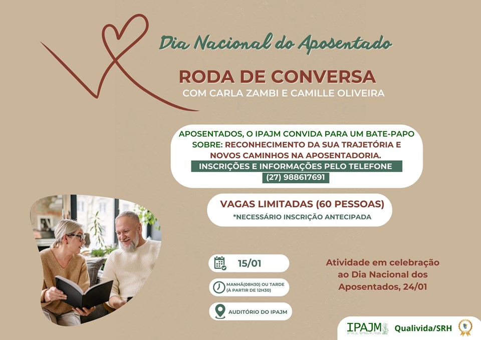 No próximo 15 de janeiro, aposentados terão a oportunidade de participar de roda de conversa, nos turnos da manhã ou da tarde, com o tema “Reconhecimento da sua trajetória e novos caminhos na aposentadoria”. O encontro será realizado no auditório do Instituto de Previdência do Estado (IPAJM), localizado em Vitória. É necessário fazer inscrição; vagas limitadas.