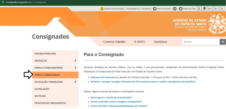 Em caso de dúvidas específicas relacionadas à consignação em folha de pagamento do Poder Executivo Estadual, você também tem a opção de acessar o site https://consignados.es.gov.br/, da Secretaria de Estado de Gestão e Recursos Humanos (Seger).