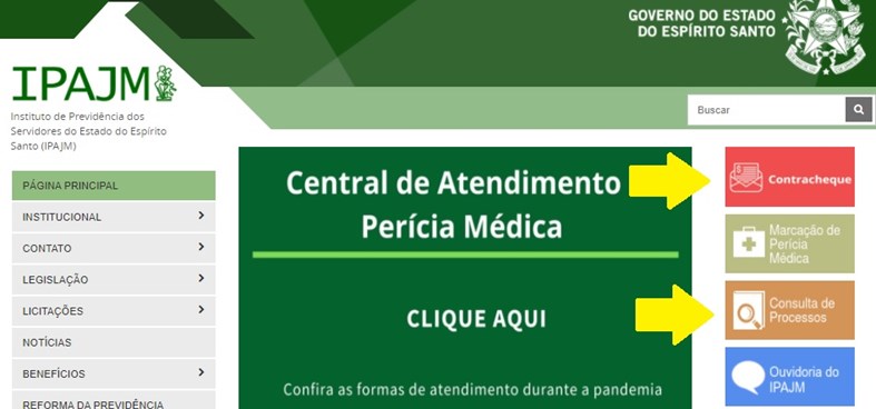 É possível conferir várias informações e serviços, sem sair de casa, no site do IPAJM www.ipajm.es.gov.br. Para visualizar contracheques, basta clicar no banner localizado à direita da página – conforme mostra imagem abaixo - e seguir o passo a passo. Precisa consultar tramitação de processos que estão no Instituto? Há um banner intitulado "Consulta de Processos", onde o segurado pode acompanhar o andamento, uma vez que são informados o setor e a situação do processo consultado.