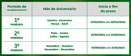 Destaca-se que o Recadastramento de 2024 foi dividido em três períodos, e os beneficiários devem se recadastrar no mês de seu aniversário.