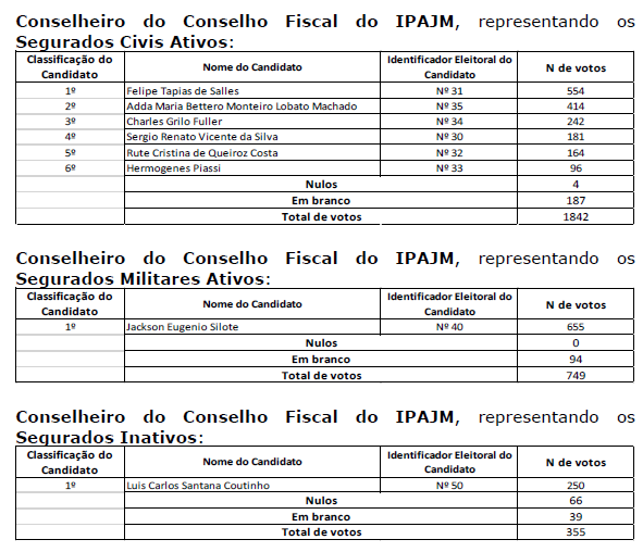 Os membros classificados em primeiro lugar ocuparão as vagas como titulares para cada um dos Conselhos, por categoria (ativo civil, ativo militar e aposentado), conforme abaixo. Eles terão mandato de três anos.