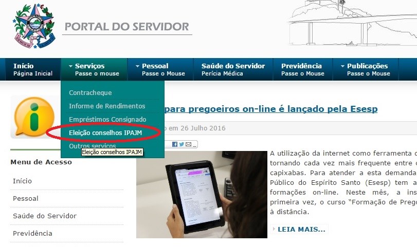 O eleitor que faz parte do Poder Executivo deve votar por meio da internet, no Portal do Servidor (www.servidor.es.gov.br), no link Serviços/Eleição Conselhos IPAJM, conforme imagem I abaixo. Para isso, é necessário que ele preencha os campos “número funcional” e “senha” – imagem II - que é a mesma aplicada para acessar contracheque, margem consignável para empréstimo e informe de rendimento para Imposto de Renda nessa página.