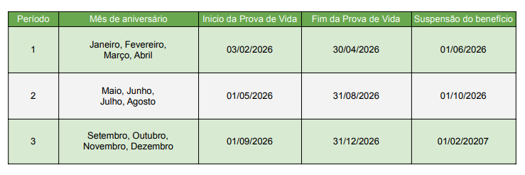 Exemplificando: Se Paulo faz aniversário em janeiro, ele deve realizar a Prova de Vida no primeiro período, ou seja, até o dia 30/04/2026. Maria faz aniversário em julho; por isso, ela pertence ao segundo período, que abrange os meses de maio a agosto. Assim, Maria tem de 01/05 a 31/08 para realizar o recadastramento. Antônio faz aniversário em dezembro e, portanto, deverá realizar a Prova de Vida no último período, ao final do ano.